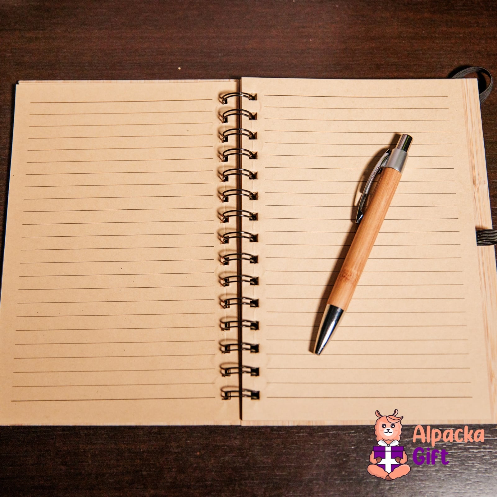 - Material: Coperta agendei precum si pixul sunt fabricate din lemn de bambus tratat pentru a le asigura durabilitatea și pentru a le scoate în evidență textura unică.
