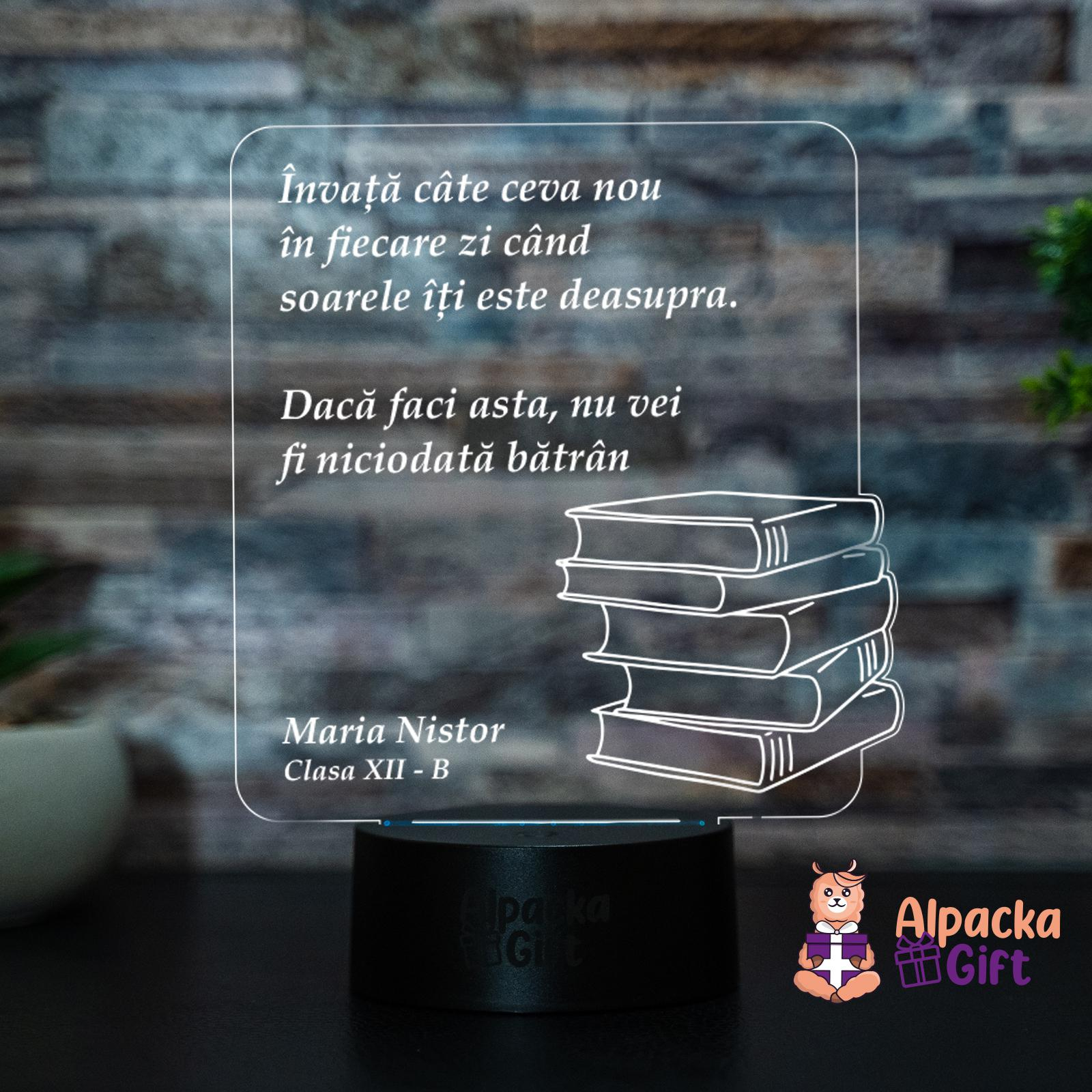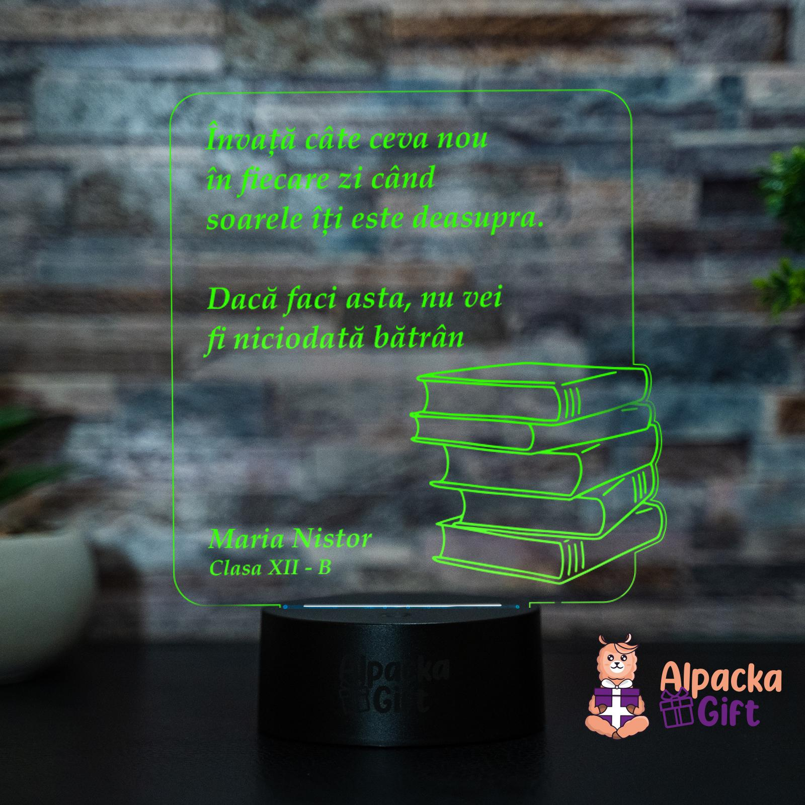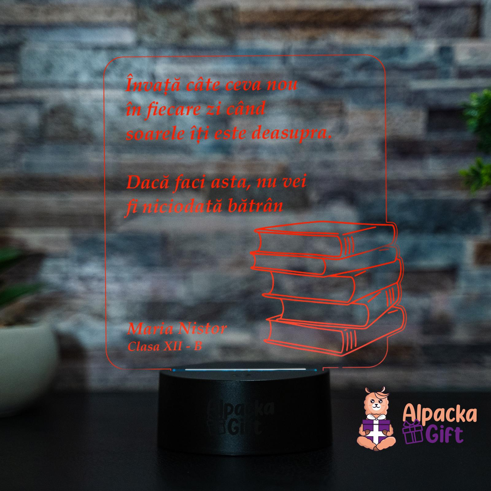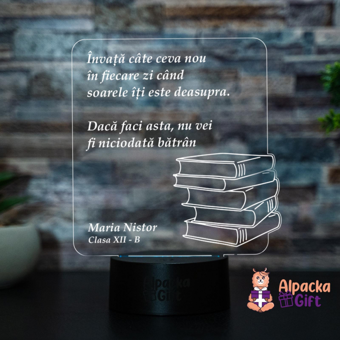8 VARIANTE DE SUPORT Pe lângă numărul nelimitat de modele de lămpi, la Alpacka Gift poți alege dintre 8 variante de suport cu culori și specificații diferite. Astfel poți fi sigur că lampa se pliază pe nevoile și preferințele tale. Negru: 7 culori și 2 jocuri de lumini; Control prin Buton Tactil (pe suport); Conținut pachet: 1 x placă acrilică, 1 x suport cu tehnologie LED, 1 x cablu USB. Alb sau Negru cu Difuzor Bluetooth: 7 culori și 3 jocuri de lumini (include jocul de lumini în ritmul muzicii); Control prin Buton Tactil (pe suport); Boxă portabilă - se conectează prin Bluetooth la telefon și redă muzica; Conținut pachet: 1 x placă acrilică, 1 x suport cu tehnologie LED și difuzor Bluetooth, 1 x cablu USB. Alb Luminat: 16 culori și 4 jocuri de lumini; Control prin Telecomandă și prin Buton Tactil (pe suport); Posibilitatea de a porni/opri lampa, de a regla intensitatea luminii și de a schimba culoarea sau modul de iluminare din telecomandă; Suportul luminează și el în aceeași culoare ca și placheta acrilică; Conținut pachet: 1 x placă acrilică, 1 x suport cu tehnologie LED, 1 x telecomandă, 1 x cablu USB. Lemn cu Ulei Parfumat - Aromaoil: 7 culori și 2 jocuri de lumini; Control prin Buton Tactil (pe suport) + buton ON/OFF (pe spatele suportului); Încalzitor pentru ulei parfumat - evaporă uleiul răspândind în aer aroma acestuia; Material: lemn de bambus; Conținut pachet: 1 x placă acrilică, 1 x suport cu tehnologie LED și încalzitor pentru uleiul parfumat, 1 x ulei de lavanda 10 ml, 1 x cablu USB.