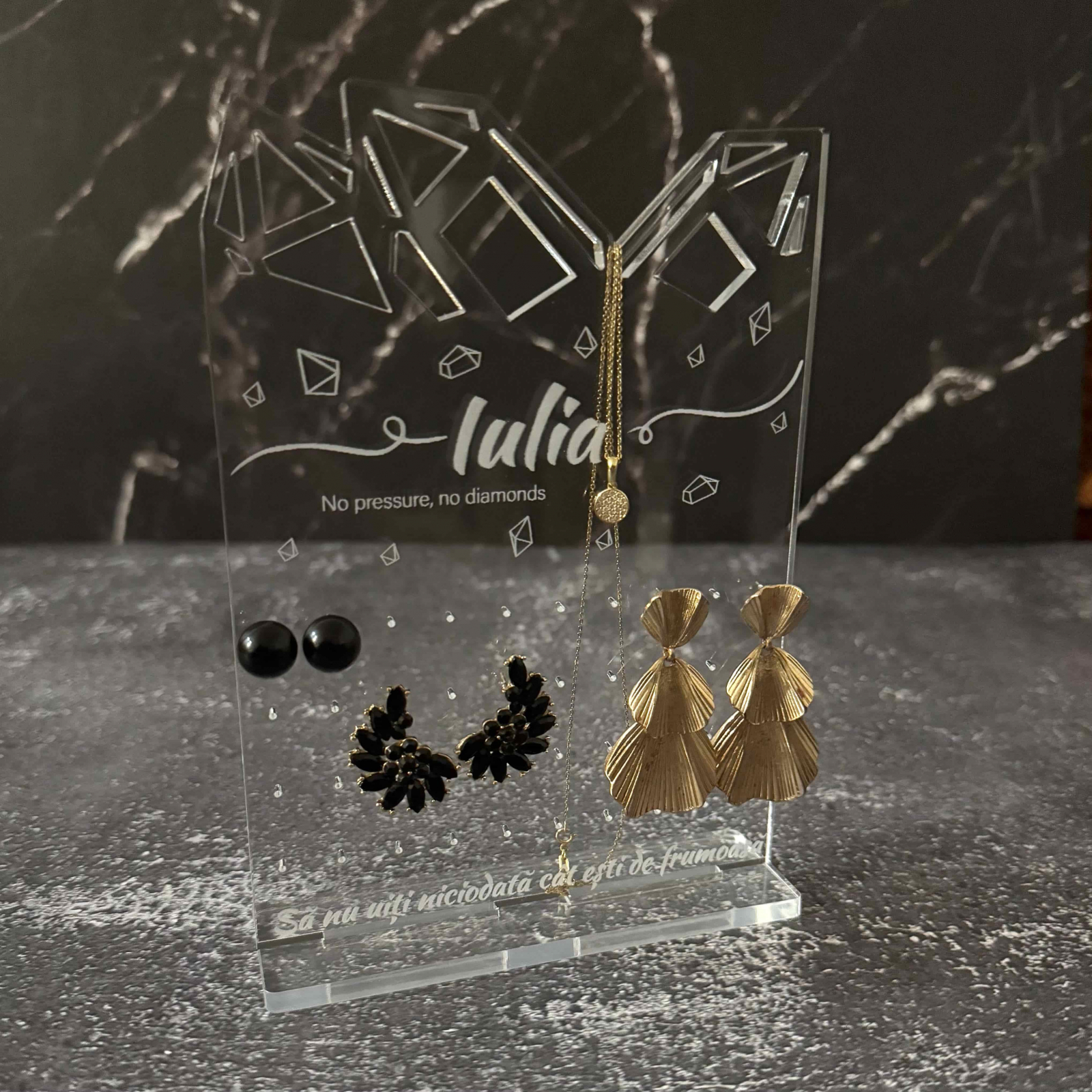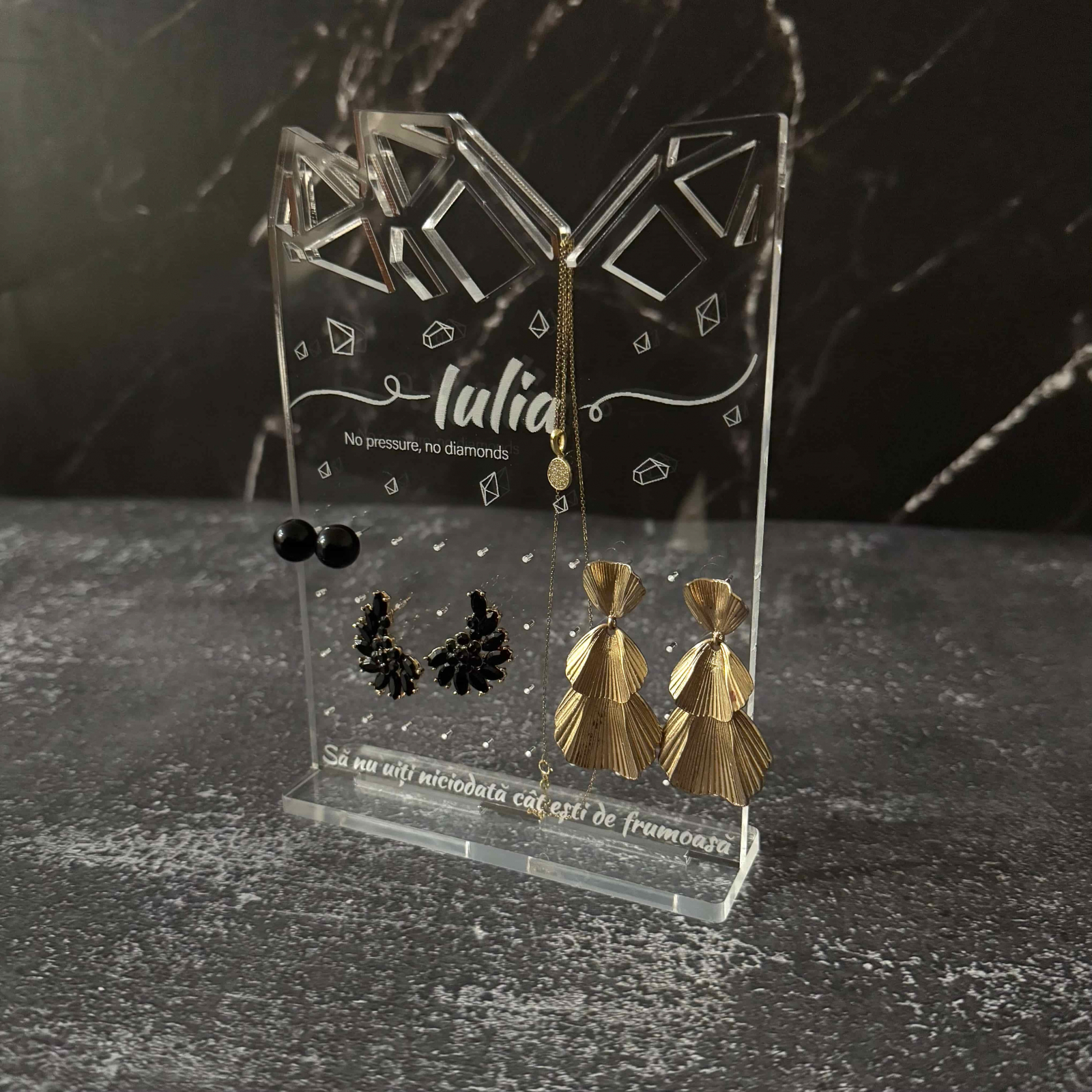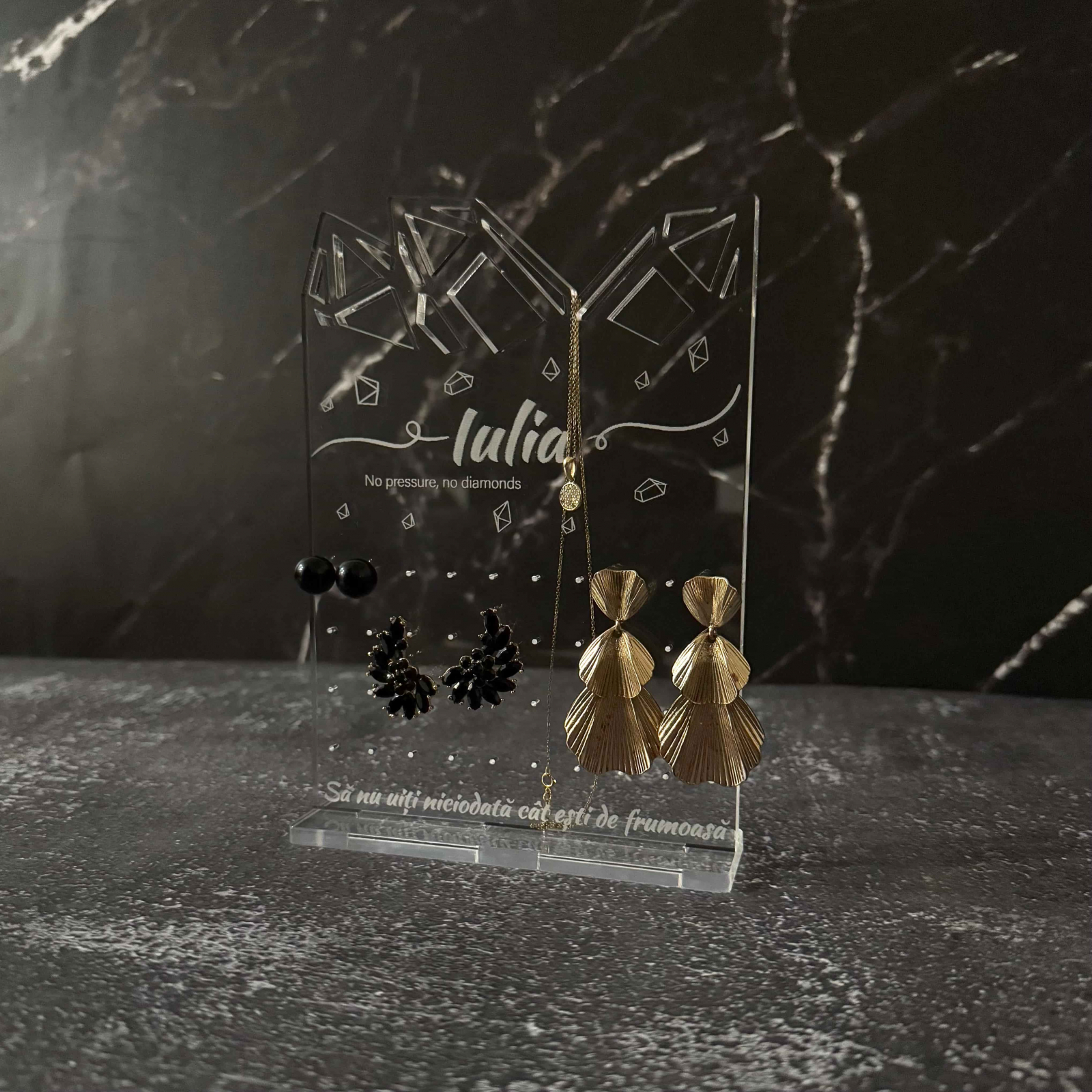 Organizează-ți bijuteriile cu stil și rafinament cu acest suport premium, realizat din sticlă acrilică gravată și tăiată cu laser pentru un finisaj impecabil. Disponibil în două variante, acest suport nu este doar practic, ci și un element decorativ elegant, perfect pentru orice spațiu.