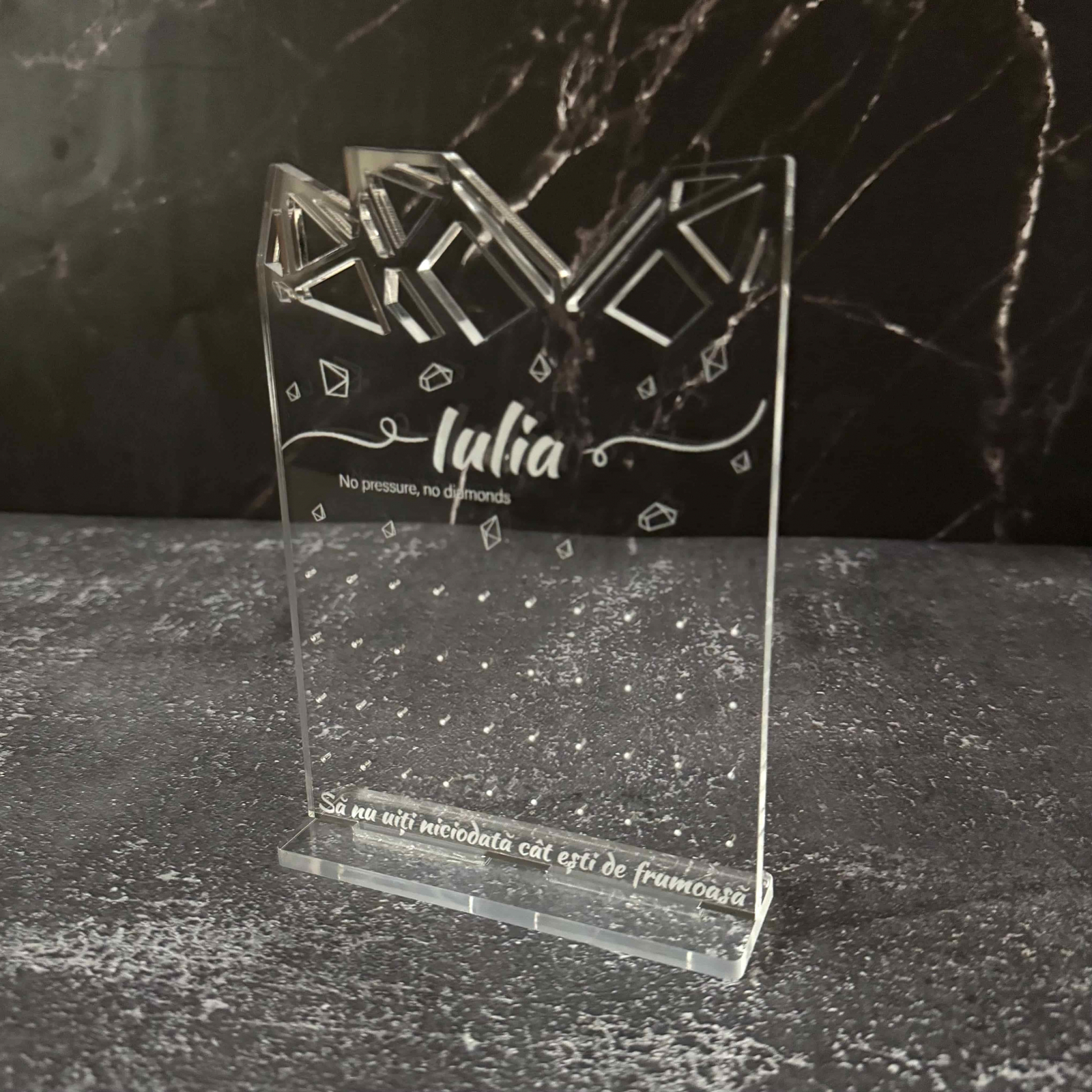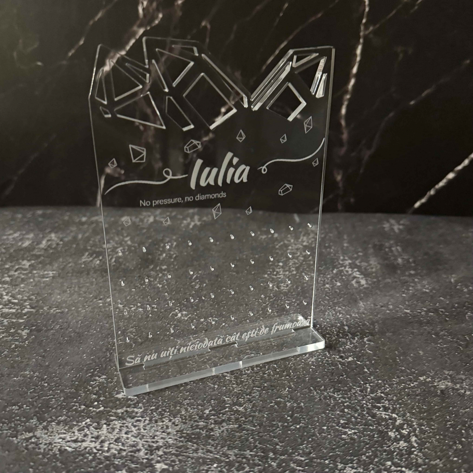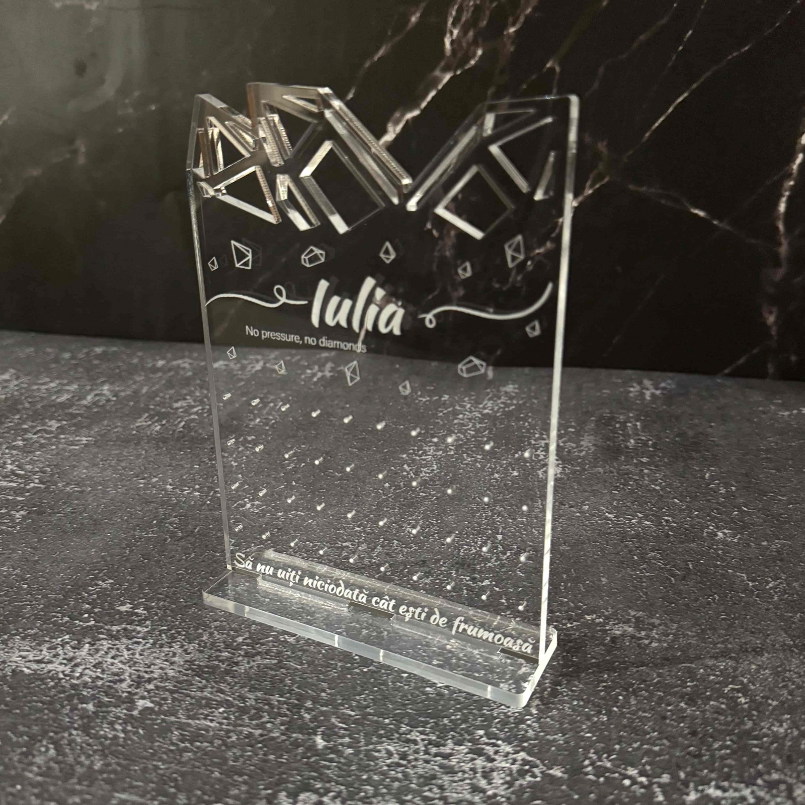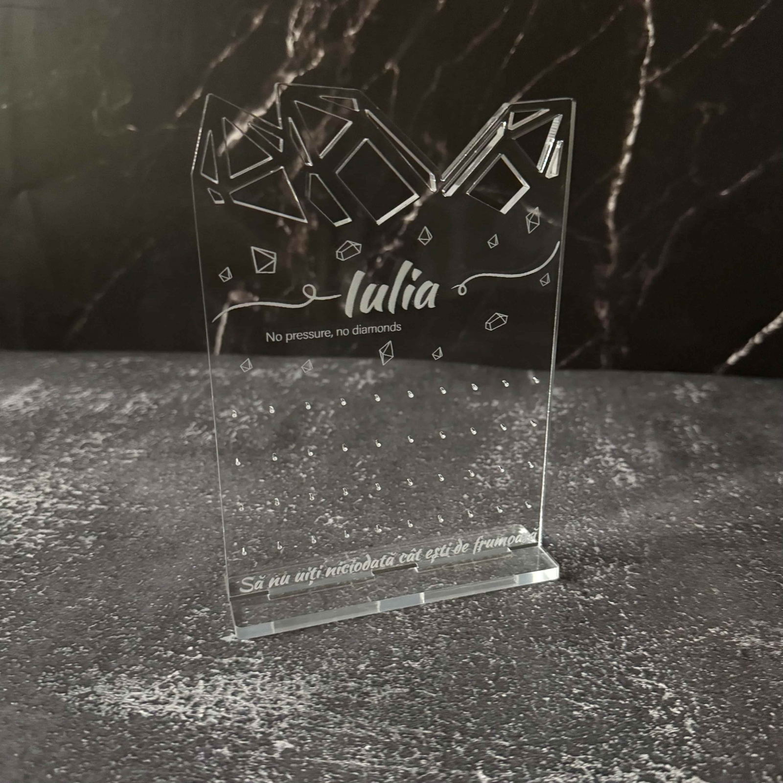 Organizează-ți bijuteriile cu stil și rafinament cu acest suport premium, realizat din sticlă acrilică gravată și tăiată cu laser pentru un finisaj impecabil. Disponibil în două variante, acest suport nu este doar practic, ci și un element decorativ elegant, perfect pentru orice spațiu.