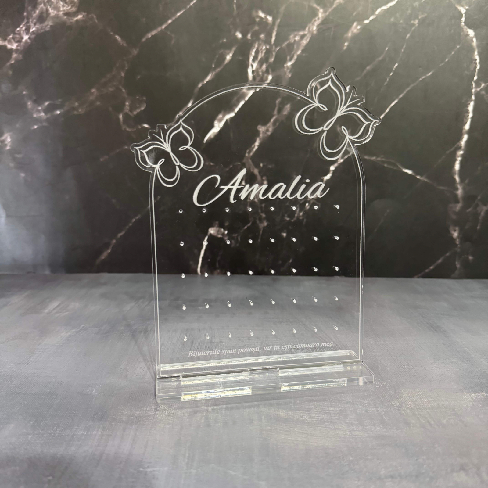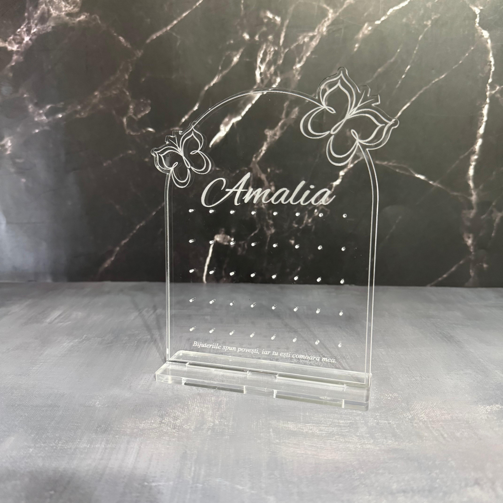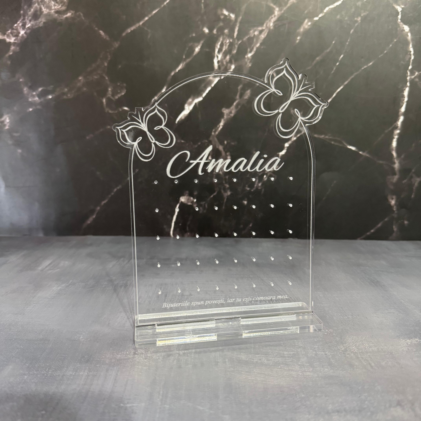 Organizează-ți bijuteriile cu stil și rafinament cu acest suport premium, realizat din sticlă acrilică gravată și tăiată cu laser pentru un finisaj impecabil. Disponibil în două variante, acest suport nu este doar practic, ci și un element decorativ elegant, perfect pentru orice spațiu.
