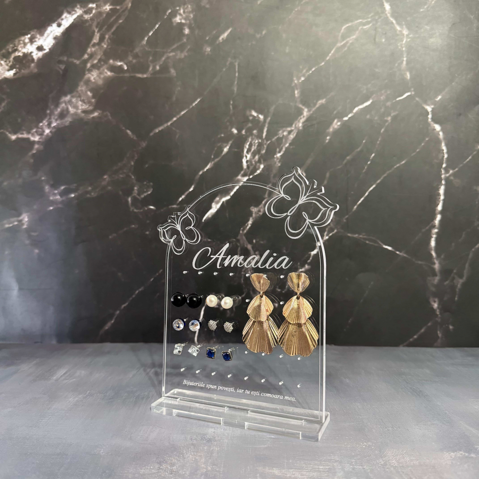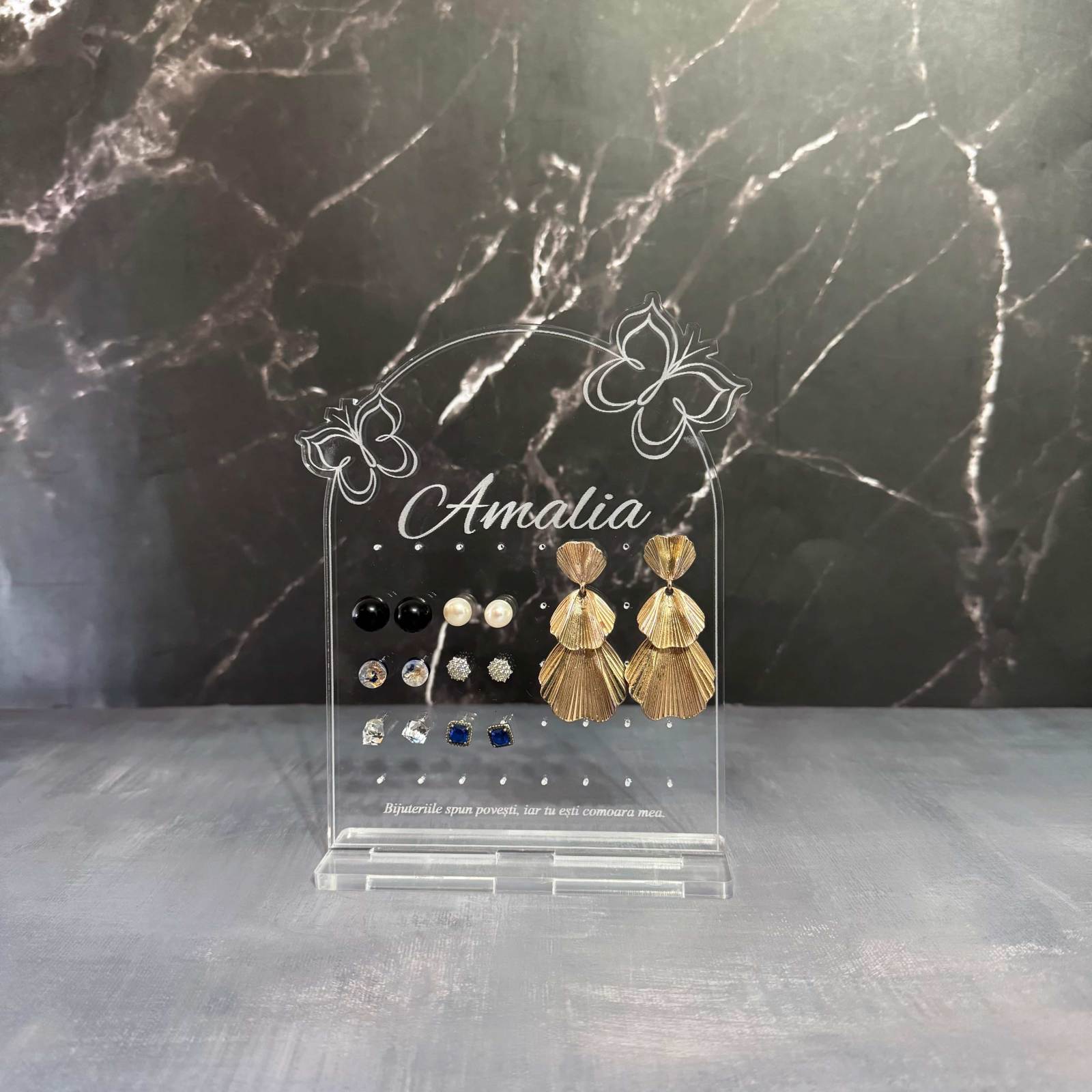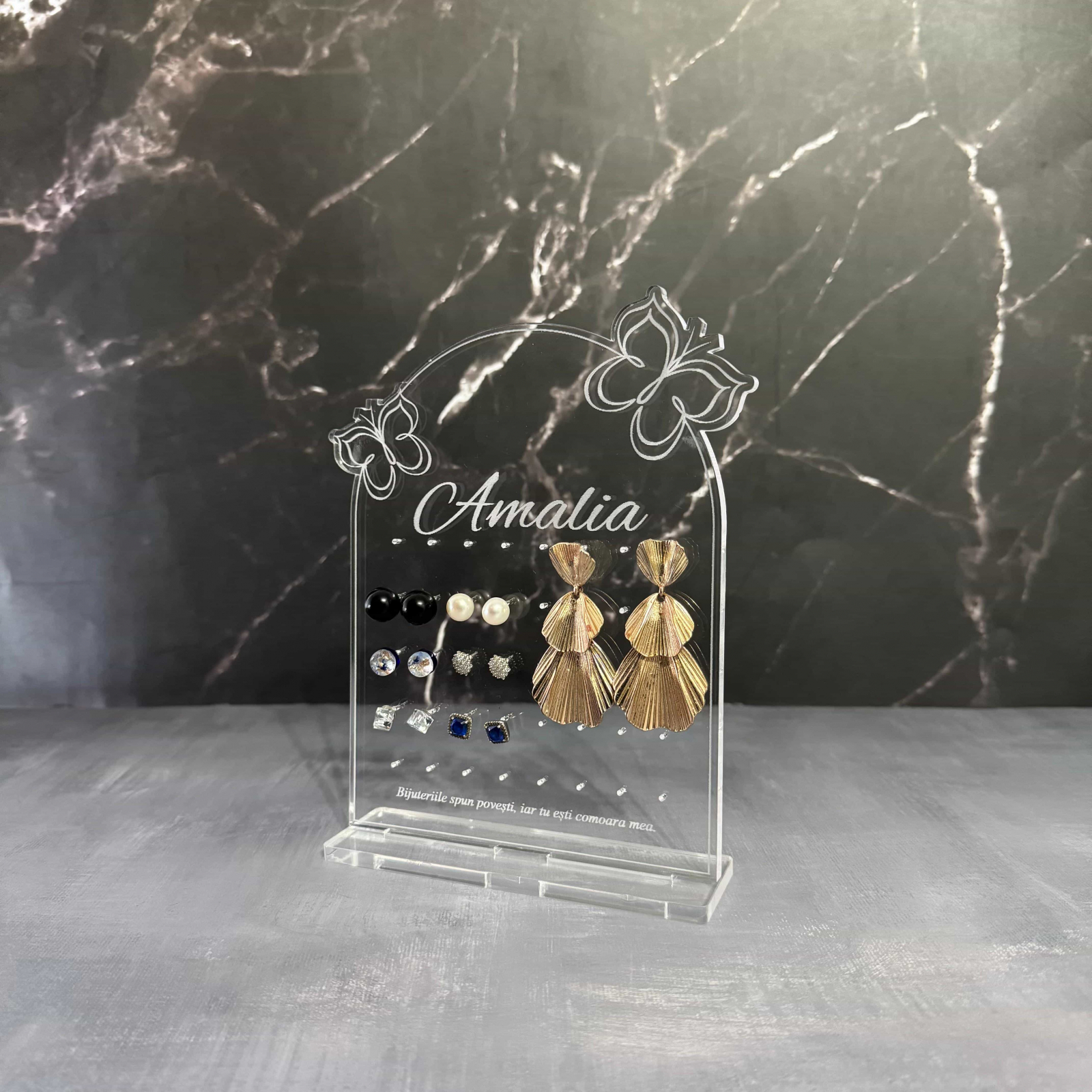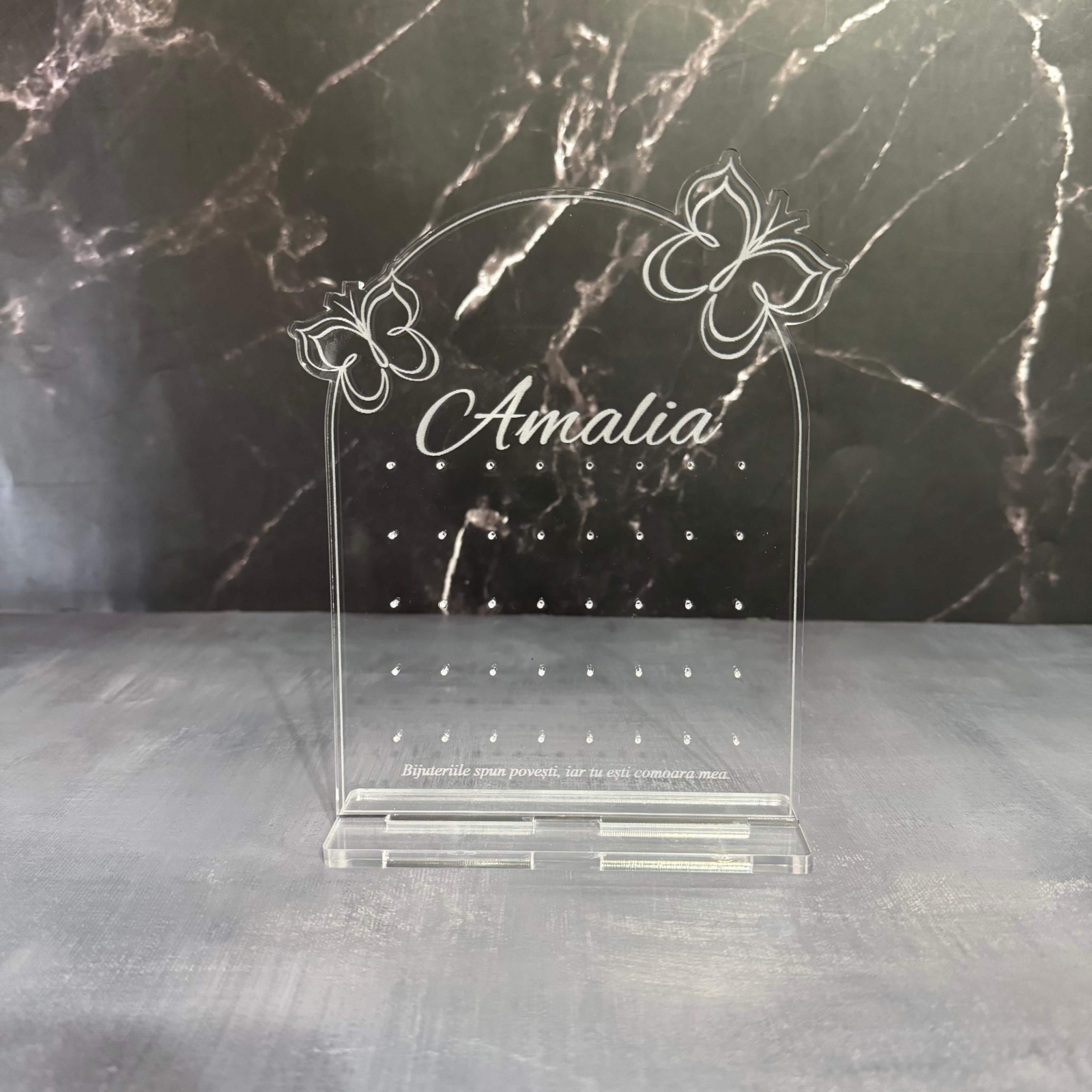 Organizează-ți bijuteriile cu stil și rafinament cu acest suport premium, realizat din sticlă acrilică gravată și tăiată cu laser pentru un finisaj impecabil. Disponibil în două variante, acest suport nu este doar practic, ci și un element decorativ elegant, perfect pentru orice spațiu.
