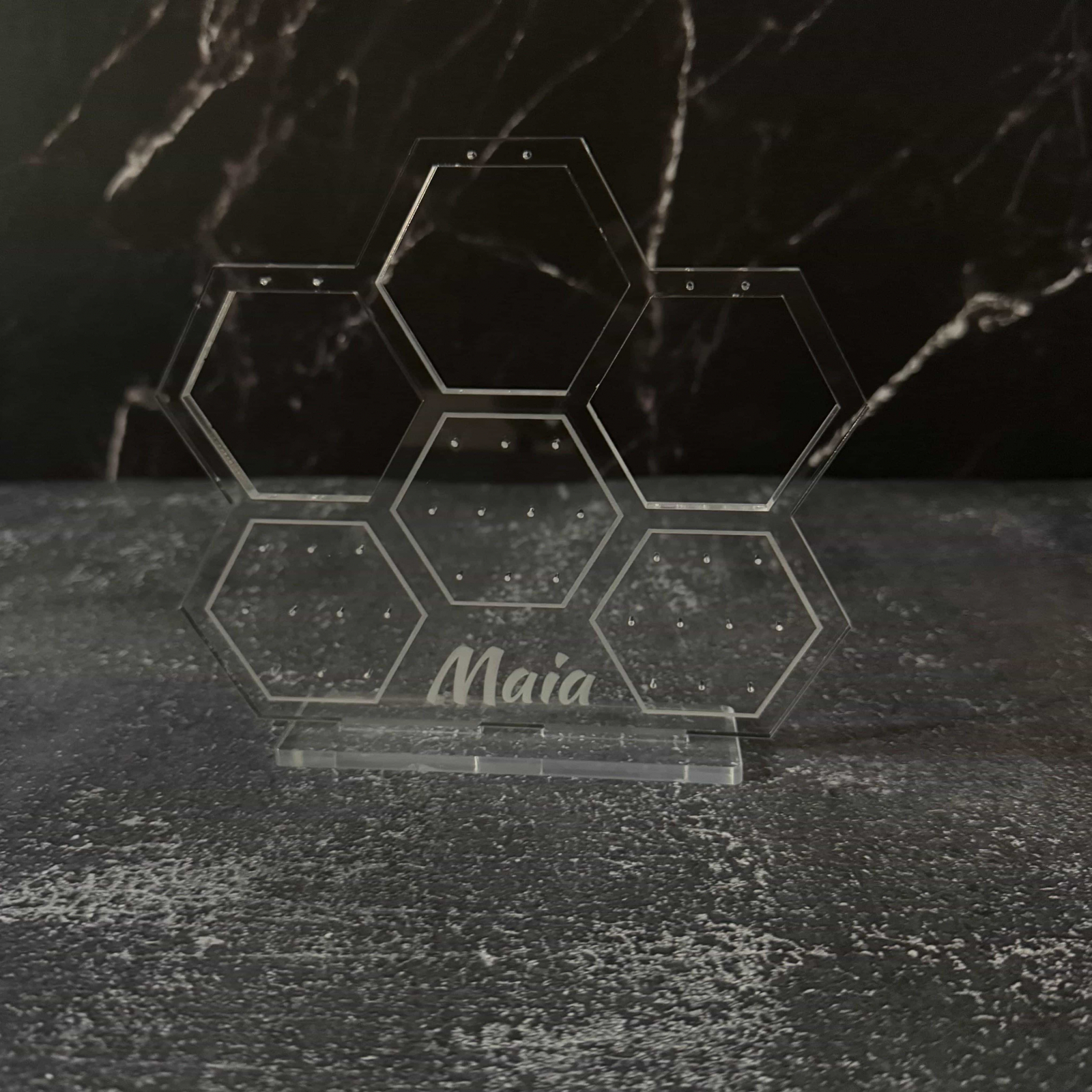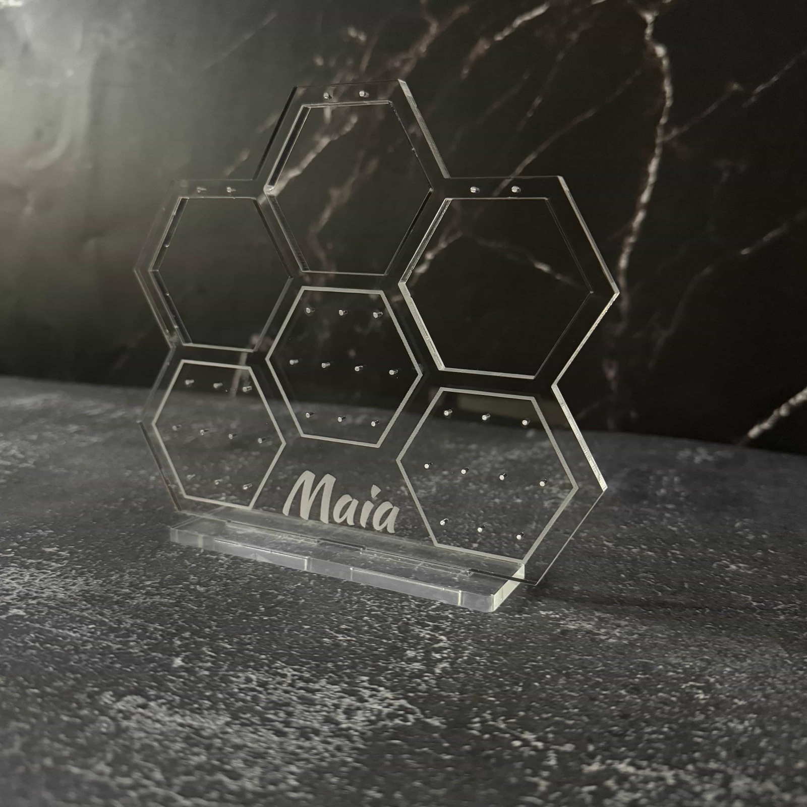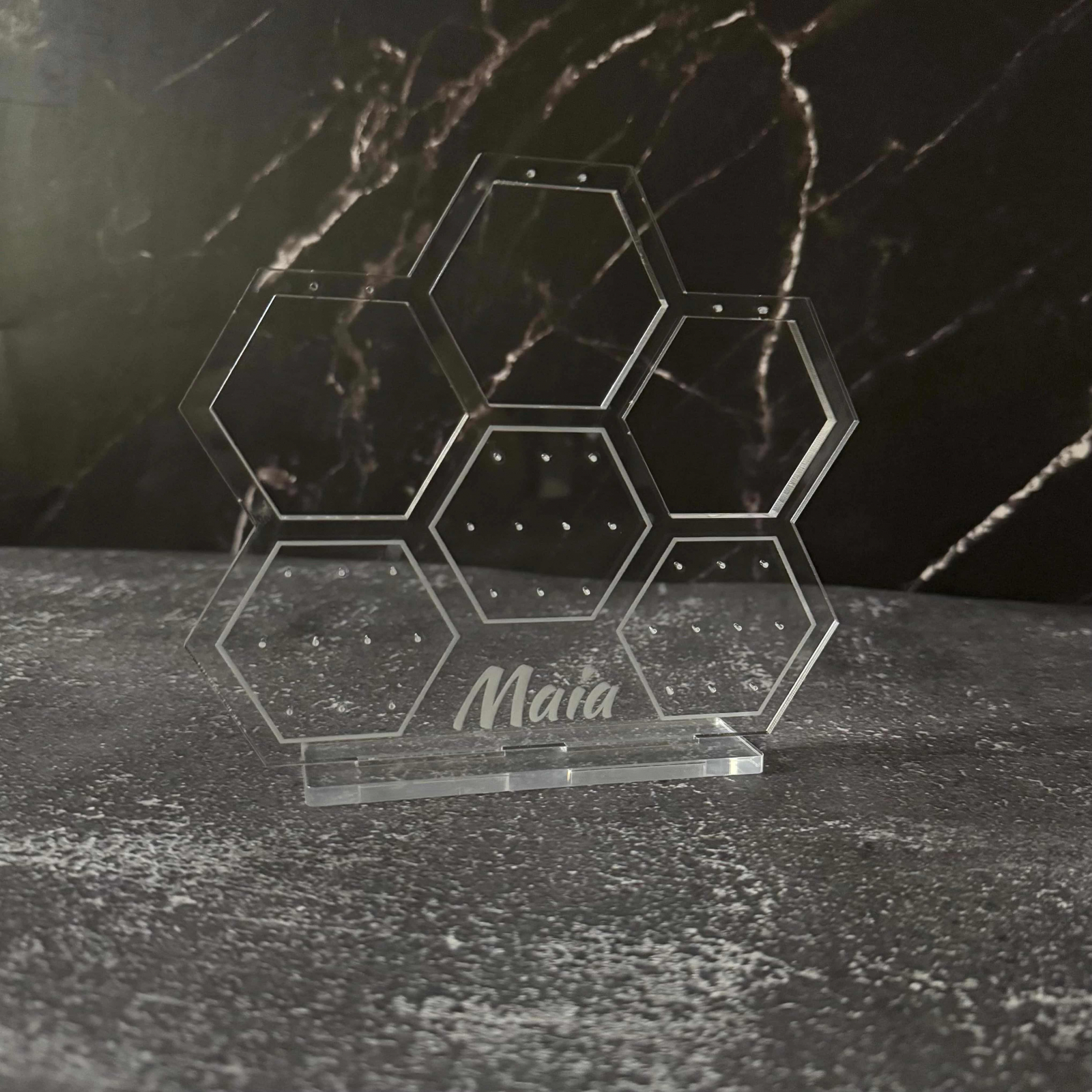 Organizează-ți bijuteriile cu stil și rafinament cu acest suport premium, realizat din sticlă acrilică gravată și tăiată cu laser pentru un finisaj impecabil. Disponibil în două variante, acest suport nu este doar practic, ci și un element decorativ elegant, perfect pentru orice spațiu.