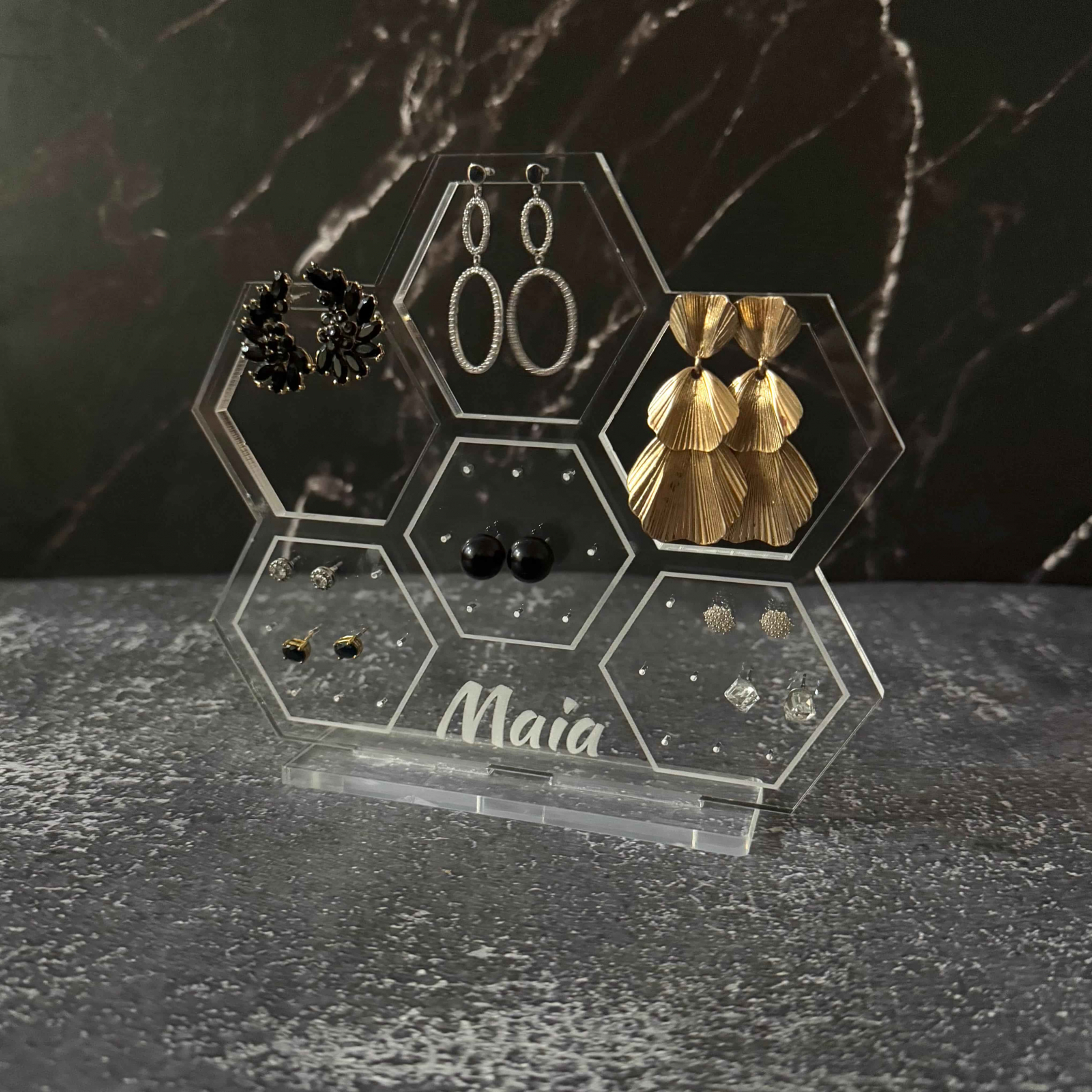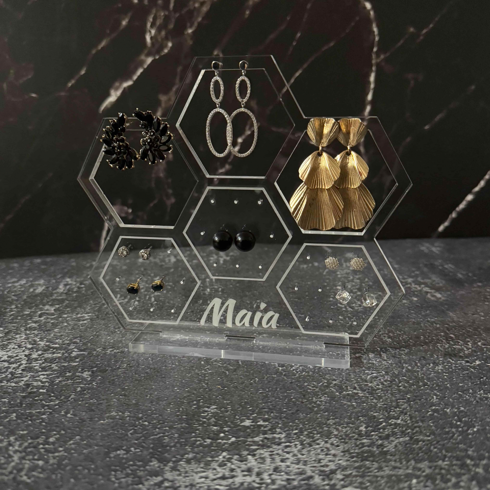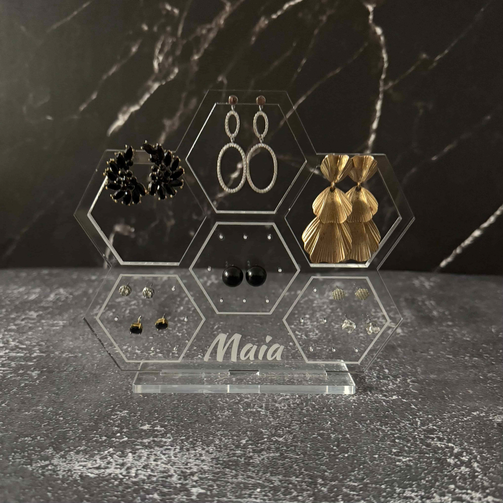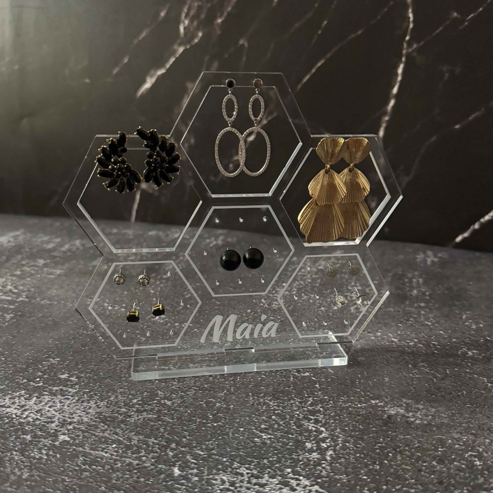 Organizează-ți bijuteriile cu stil și rafinament cu acest suport premium, realizat din sticlă acrilică gravată și tăiată cu laser pentru un finisaj impecabil. Disponibil în două variante, acest suport nu este doar practic, ci și un element decorativ elegant, perfect pentru orice spațiu.