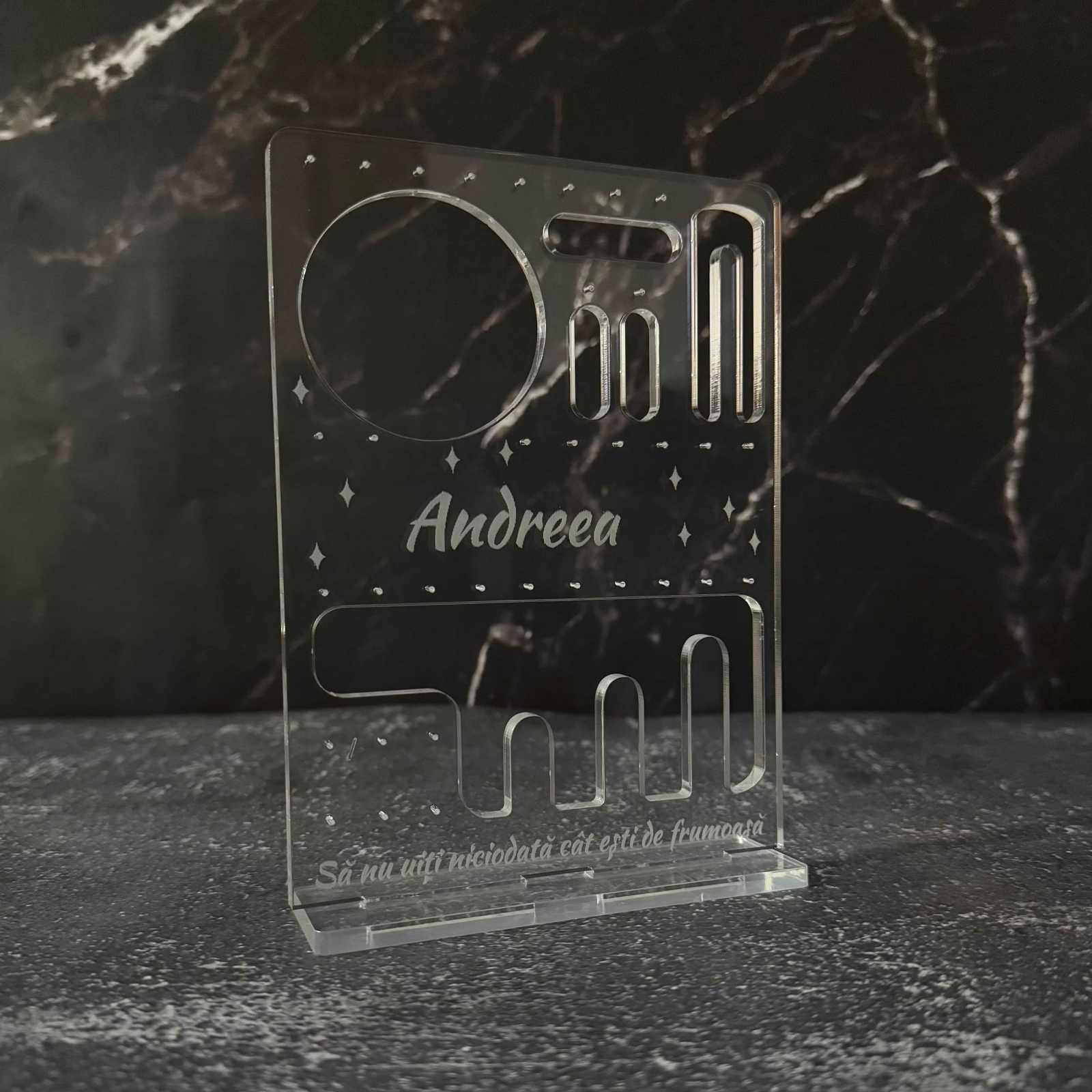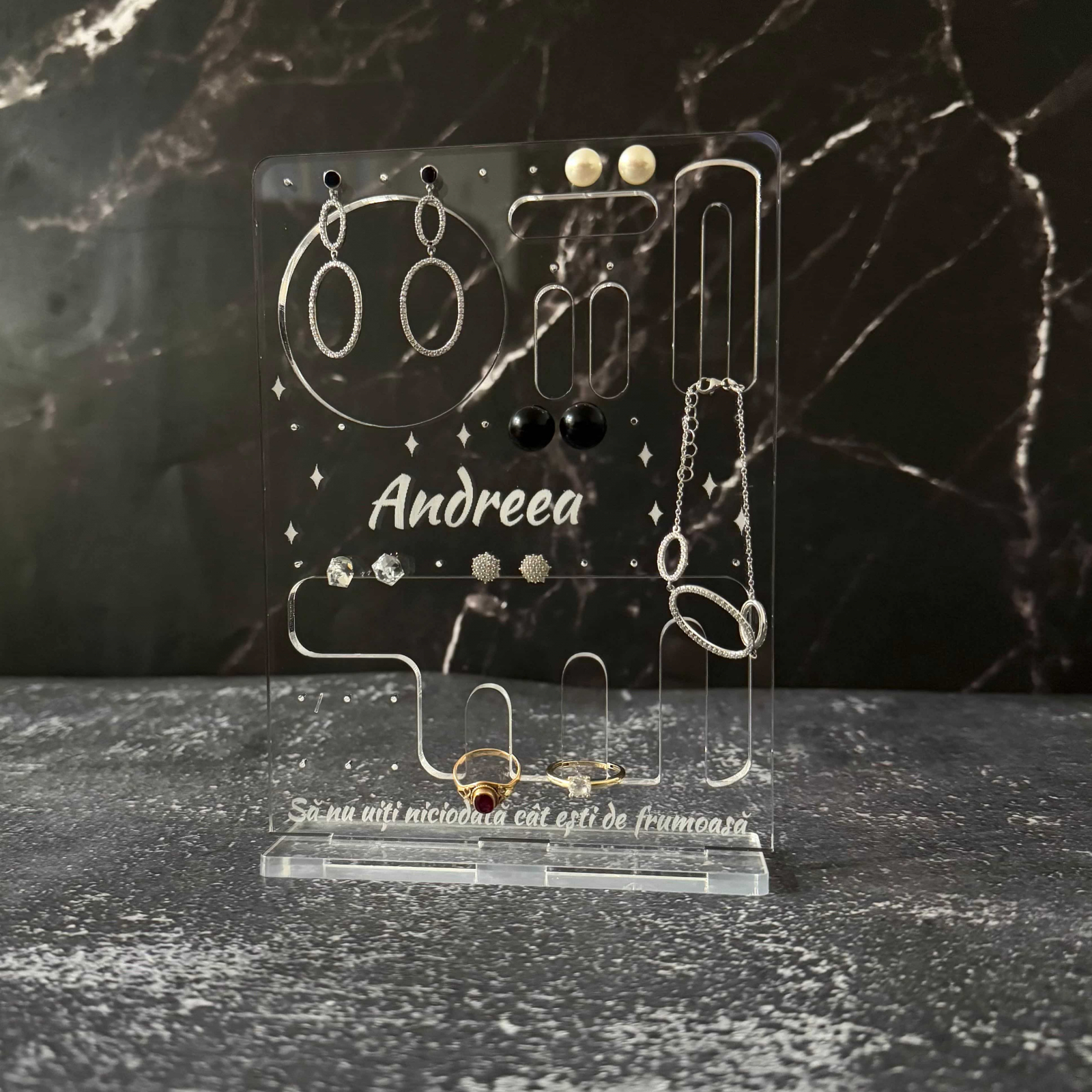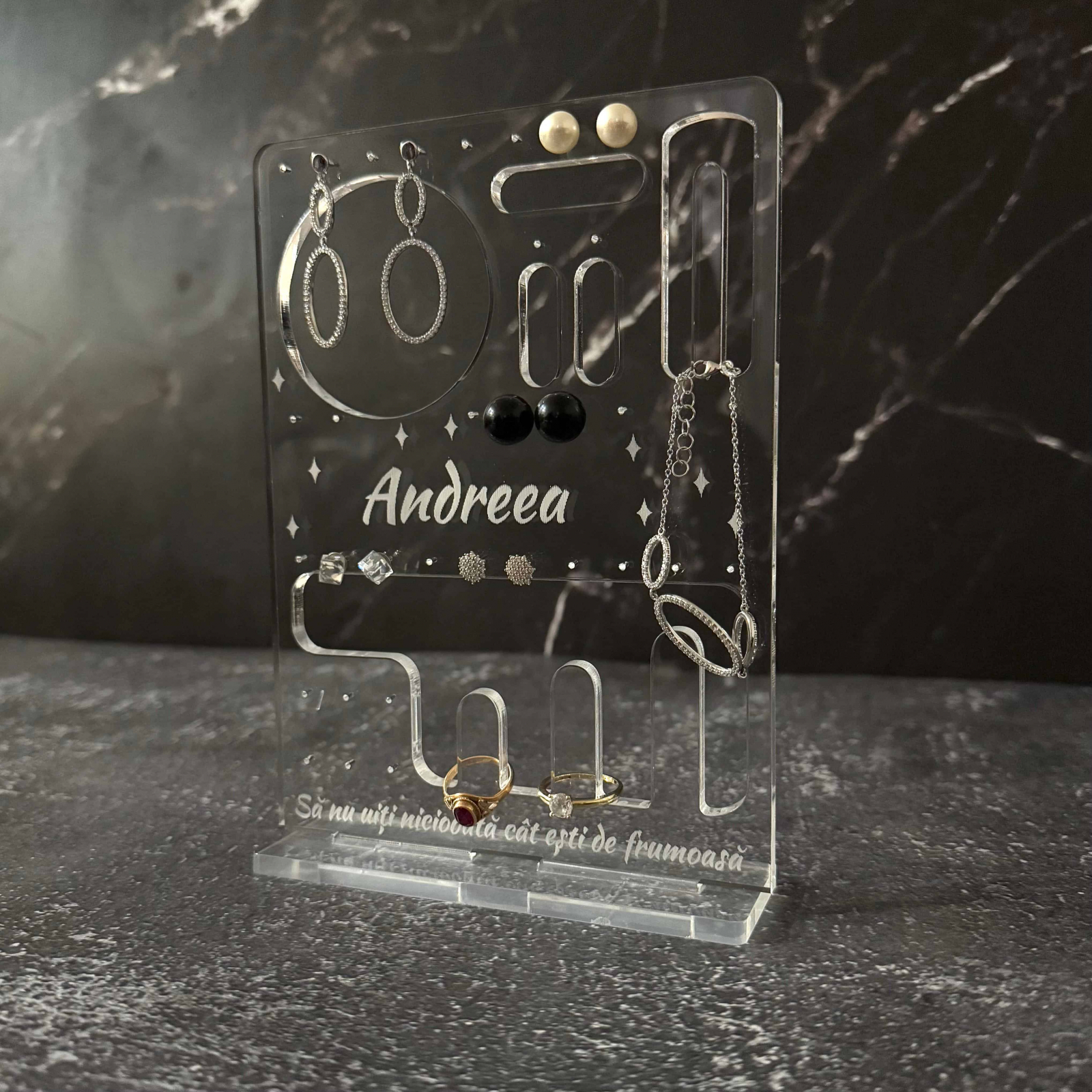 Organizează-ți bijuteriile cu stil și rafinament cu acest suport premium, realizat din sticlă acrilică gravată și tăiată cu laser pentru un finisaj impecabil. Disponibil în două variante, acest suport nu este doar practic, ci și un element decorativ elegant, perfect pentru orice spațiu.
