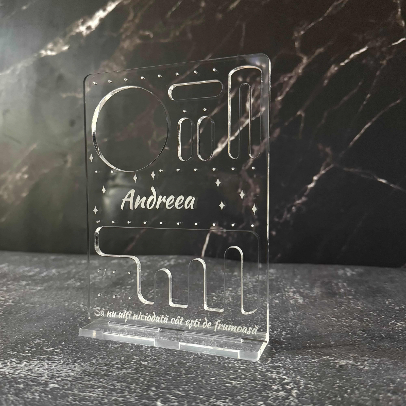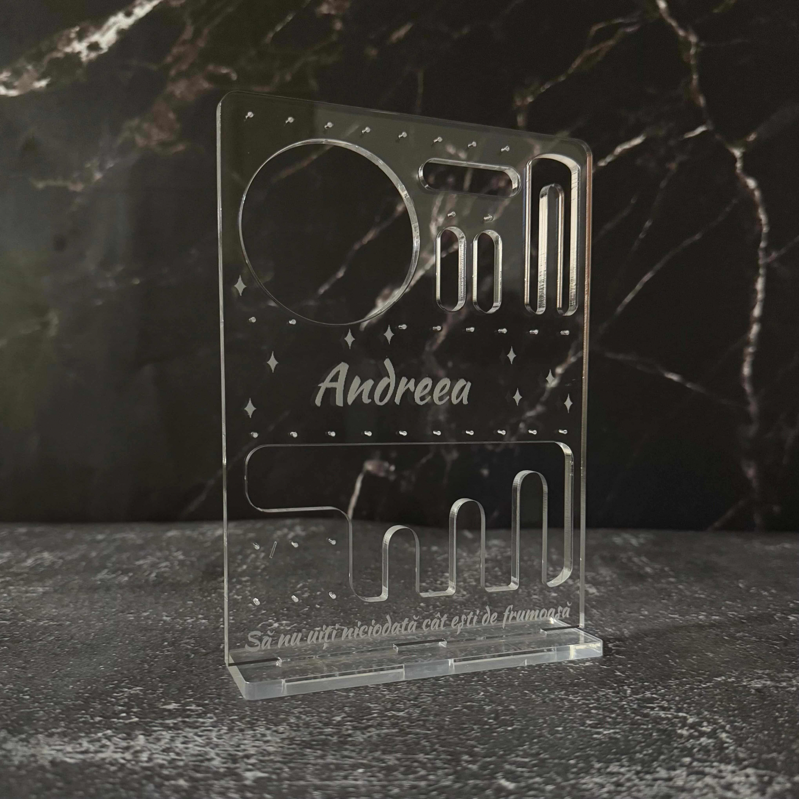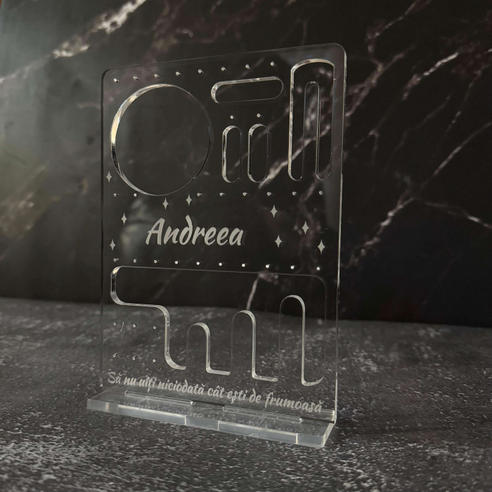 Organizează-ți bijuteriile cu stil și rafinament cu acest suport premium, realizat din sticlă acrilică gravată și tăiată cu laser pentru un finisaj impecabil. Disponibil în două variante, acest suport nu este doar practic, ci și un element decorativ elegant, perfect pentru orice spațiu.